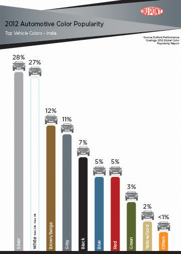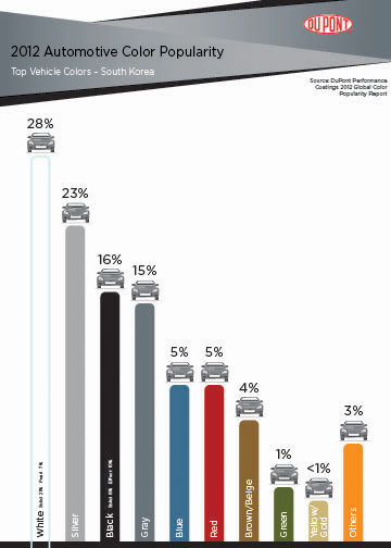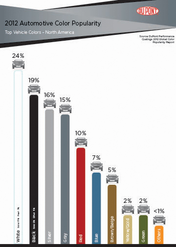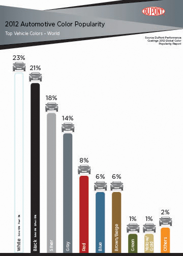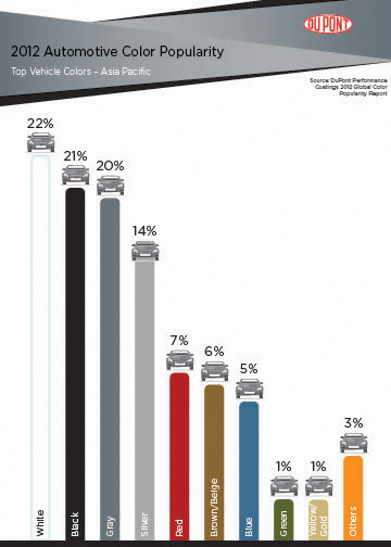 WILMINGTON, Del., Dec. 6, 2012 – White/white pearl dominates the global automotive color popularity ranks for the second consecutive year, according to the 2012 DuPont Automotive Color Popularity Report, released today. Black/black effect moves into second place in the global ranks this year, largely due to the increased popularity in the Asia Pacific market as this color has a worldwide perception of high quality and luxury. Silver fell to third, as its popularity has waned due to its overall gradual decline, especially in the critical large automotive markets of Europe and Asia.