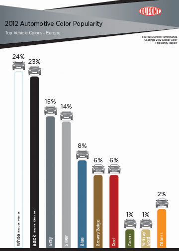 Gray (15 percent) and silver (14 percent) have both decreased in popularity this year, while blue continues to increase, grabbing eight percent of the overall European market in 2012.