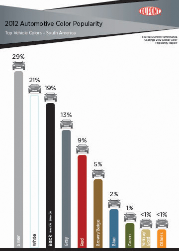 Silver led the South American market with 29 percent share, though it dropped 1 percent from last year. White/white pearl (21 percent) increased 4 percent and moves into second place, with 21 percent of the market in South America. Black/black effect (19 percent), gray (13 percent), red (9 percent), brown/beige (5 percent), blue (2 percent) and green (1 percent) follow. Decreases in silver, gray and red were comparable with increases in white and blue in 2012. Specific to Brazil, the color rankings mirrored the overall South American market rankings for the top 10.