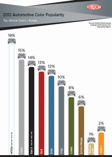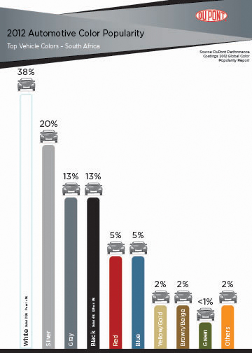 White/white pearl moved to top the ranks in Europe in 2012, and was in the leading position as the most popular car color in North America (U.S. and Canada), Japan, South Korea, Russia, South Africa and Mexico. Overall, white/white pearl represents 23 percent of the global market in DuPont’s 2012 report.