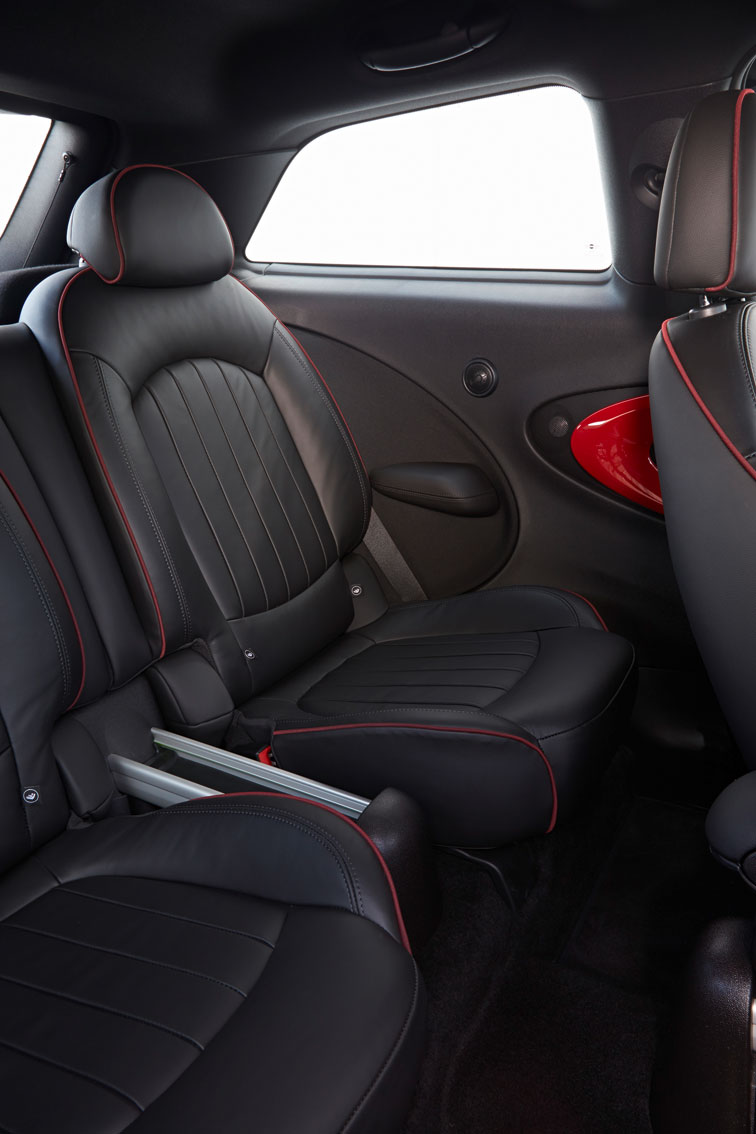 The cockpit features the usual JCW steering wheel, badges and sports seats, also in the rear. The latter can be folded flat to extend the cargo area from 11.65 to 31.13 cubic feet