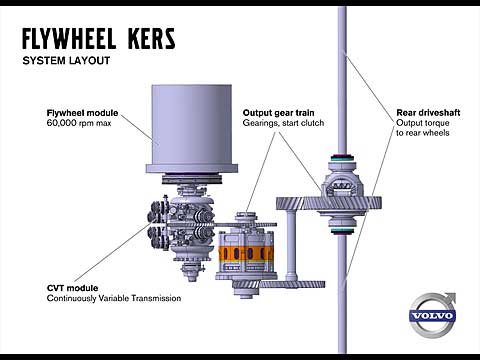 The experimental system, known as Flywheel KERS (Kinetic Energy Recovery System), is fitted to the rear axle. During retardation, the braking energy causes the flywheel to spin at up to 60,000 revs per minute. When the car starts moving off again, the flywheel's rotation is transferred to the rear wheels via a specially designed transmission.