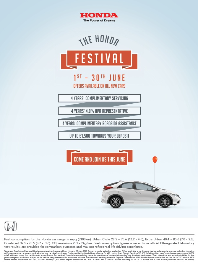 The Honda Festival started on Saturday 1 June and will be running up until the end of the month. To find out more about getting into the festival spirit with Honda this June, please visit your local dealer or www.honda.co.uk/offers.