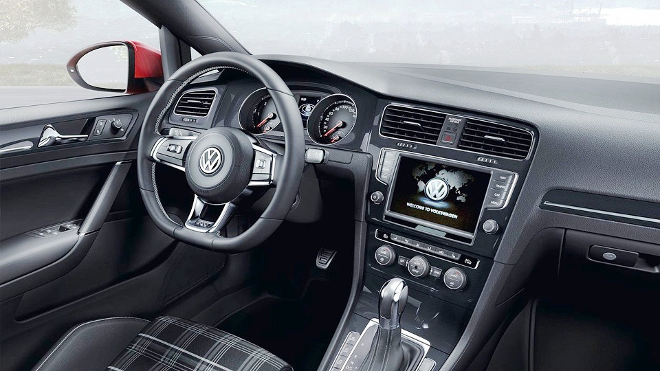 Touchscreen and ambience lighting. Along with the automatic climate control system (Climatronic), Driver Alert System and Composition Touch radio system (including SD cart slot and AUX-IN interface), ambience lighting is also a standard feature. The pedal caps and foot rest made of brushed stainless steel, the three-spoke, multifunction leather-trimmed, flat-bottomed sport steering wheel (with aluminium accents), a GTD gear shift grip and the instrument cluster with extended adjustment options of the “Premium” multifunction display are all indicative of the exclusive-sporty flair aboard the new Golf GTD.