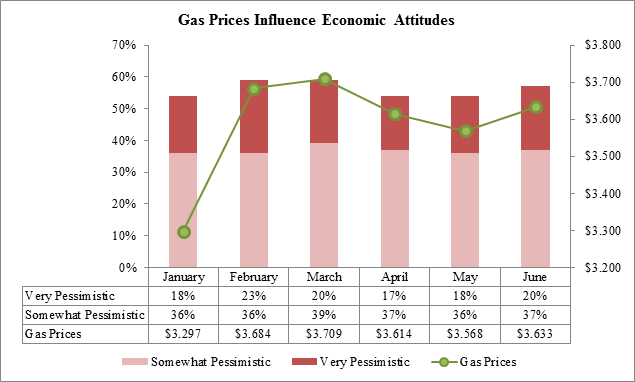 The price of a gallon of gasoline continues to have a significant impact on consumers’ perceptions of the overall economy, according to the latest findings of the monthly NACS Consumer Fuels Survey. Compared to the previous two months, an increasing percentage of U.S. consumers say they are pessimistic about the economy (57%). This rise in consumer pessimism directly tracks the early June increase in gas prices. The national gas price at the time of the survey was 6.5 cents per gallon higher than the month prior, based on reported weekly gas prices from the Oil Price Information Service (OPIS).