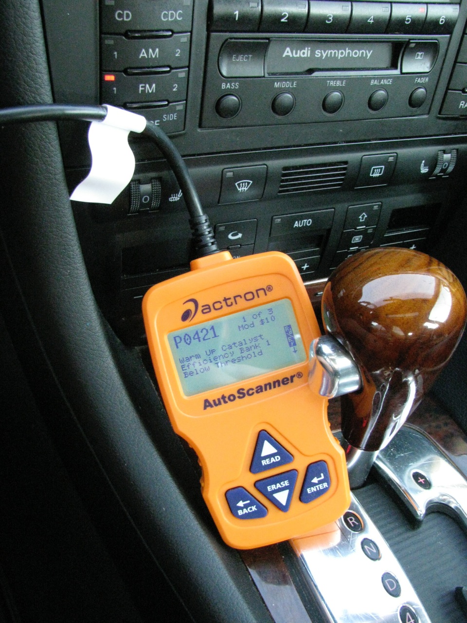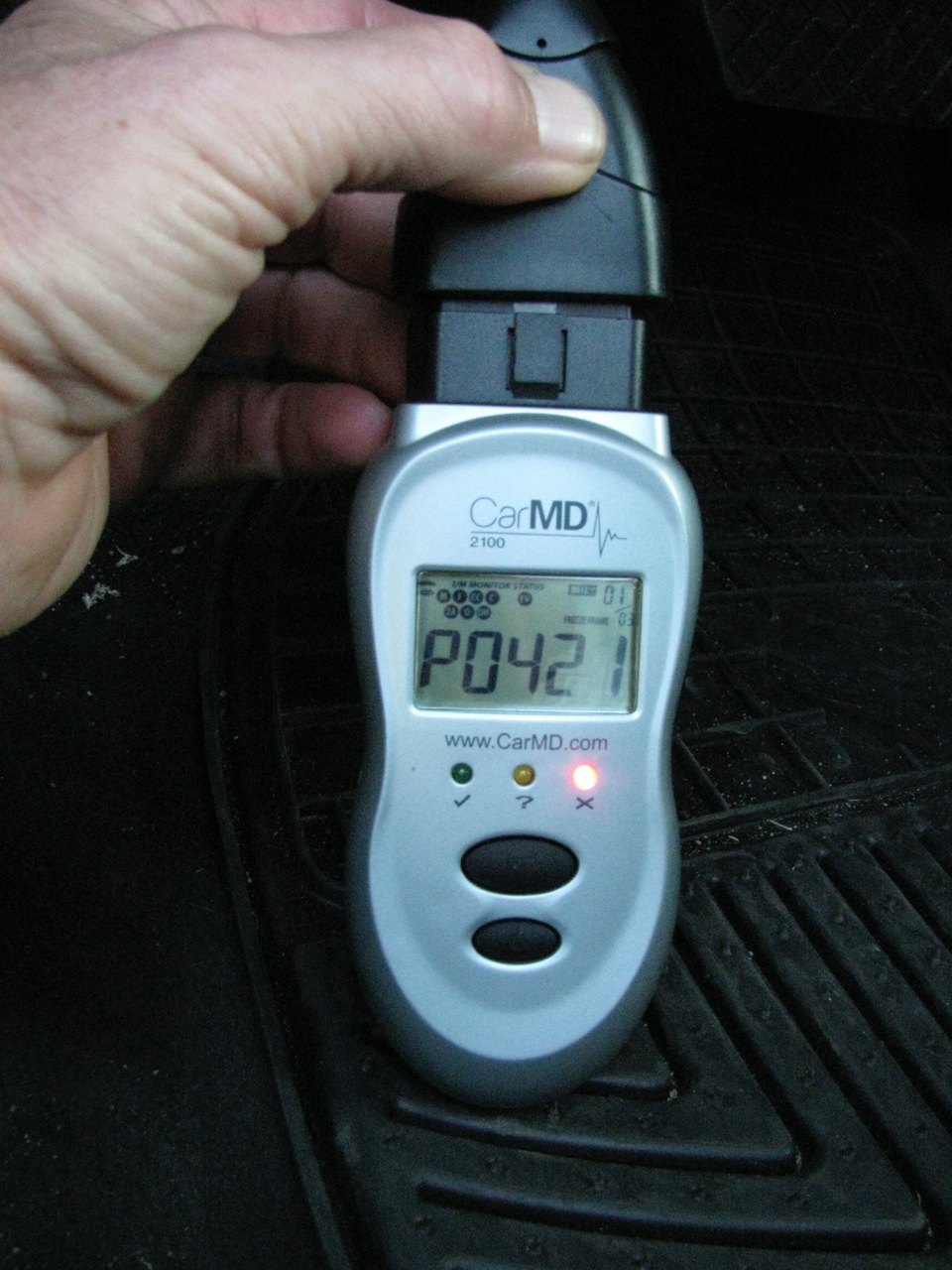 CarMD was used with its long extension, and grabbed several codes. At the office I plugged it in, then entered mileage and VIN. According to CarMD the check engine light is on and the emissions system is failing in some critical areas. CarMD says the vehicle would likely fail an emissions test, vital knowledge for a Californian and some other states. Actron simply displayed the codes and a short description