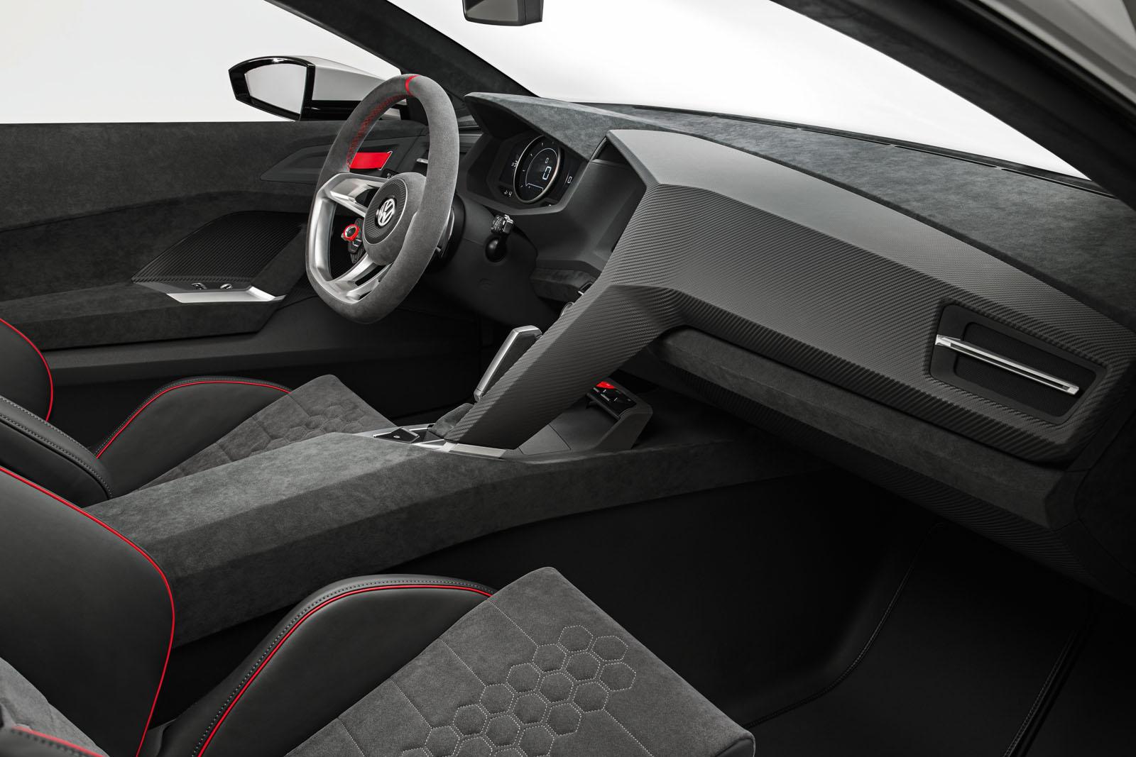 The concept is extremely light thanks to its body of carbon fiber reinforced plastic (CFRP). Even though the nose has been extended with 2 inches, the length is 0.6 inches shorter than of the GTI, mainly thanks to a more compact rear bumper. It is 2.2 inches lower and 2.8 inches wider, while the track has increased to 62.8 in. up front and 62.2 in. in the rear. Those dimensions add to a super sporty design, hinting at lots of power with the low and wide stance and the pronounced C-pillars that run wide and deep along the sides. And look at the center-lock design of the wheels… it is a trick to hide the wheel bolts for a truly racy design. No trick is the ceramic brake discs and re painted calipers, which are visible through the spokes of the 20-inch wheels.