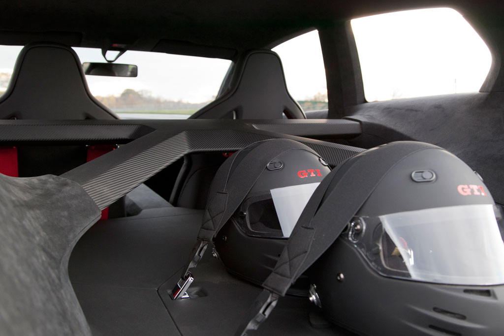 The necessary switches are at your finger tips on the flat bottomed steering wheel: the paddle shifters, the drive mode selector for ‘street’, ‘sport’ and ‘track’, and a start/stop switch. Integrated in the lower part of the center console is the button for deactivating the ESP system and one for activating the fire extinguishing system, as well as an electrical kill switch.