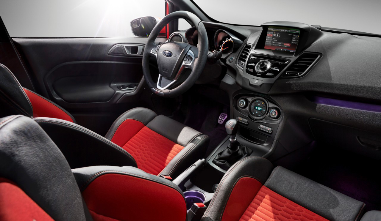 The rest of the interior is, not surprisingly, little-changed from the premium trim level of regular Fiesta. The steering wheel has audio, phone, and cruise controls on its spokes, tilt- and reach-adjustability, and an appropriately thick leather rim. Leather is also used for the shift know. Pedals are the standard for the genre aluminum and rubber. The dark monochrome color of most interior panels is offset by the body-color cloth on the seats. The main instruments are easily visible, with useful information displayed between the speedometer and tach. The MyFordTouch touchscreen controls audio, navigation, phone, and vehicle settings systems. Climate is by means of simple buttons and knobs. Audio choices are all current varieties, AM, FM, and Sirius/XM radio, CD, jack, USB, and Bluetooth from a compatible phone. Mood lighting brightens the interior at night. The rear seat should hold two medium-sized adults reasonably well, and a third in the center for less time, while still leaving a bit of luggage space. Or fold it, 60/40, for more stuff. There is a space-saver spare under the rear load floor, not a can of sealant.