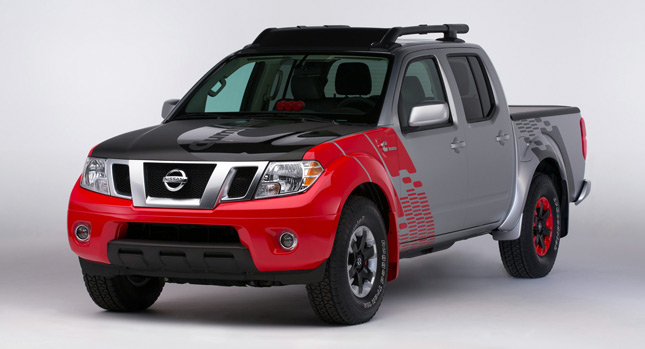 The 16-inch wheels, borrowed from a Frontier PRO-4X, have been treated with a special two-tone paint – Arrest Me Red for the rear wheels and silver in front, each accented by satin black paint. The brake calipers have also been custom painted in contrasting colors – silver rear and red front.