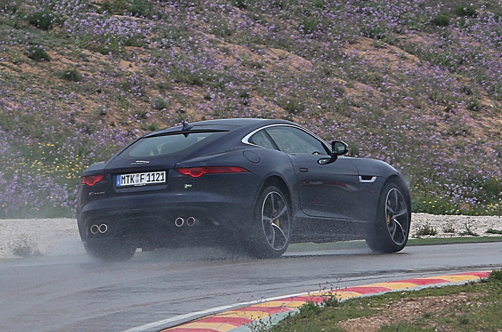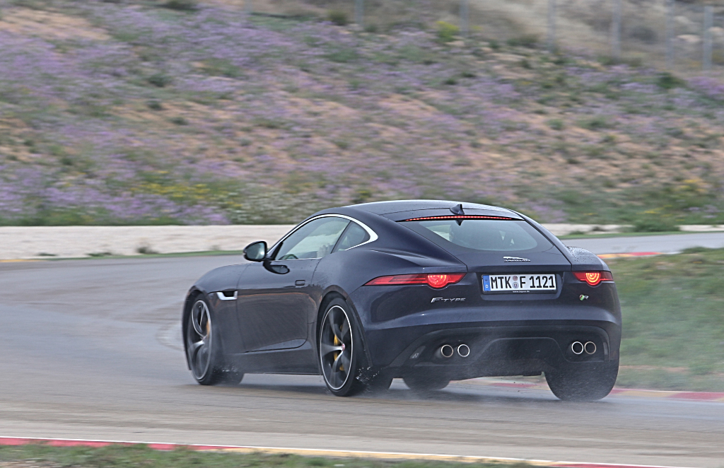 Then it is on to the handling course of Motorland, where the new torque vectoring system can be tested on the wet part of the track. The F-Type Coupe R has a new electronic slip differential that works together with Torque Vectoring by braking (TVbB). When its sensors detect that fast cornering may cause under steer, the system applies braking torque individually to the inner wheels via the ABS system. By actively turning in the nose of the car into the bend too much, we could indeed feel the system interfering. Of course, it is not magical that it will save you in every circumstance, but it will really help, practically unnoticed and also on dry road at higher speed, when a driver does not pay enough attention and/or is not precise enough.