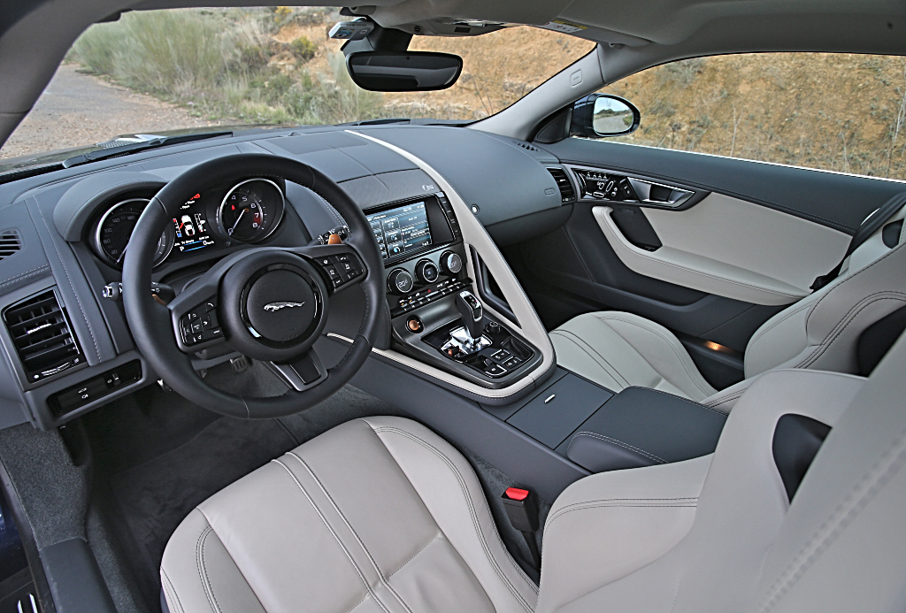We started our F-Type Coupe test drive in Spain from the airport in Lleida, a city west of Barcelona. Upon touching the copper colored on-off button in the dashboard, the engine produces a retained growl, but when pushing the throttle you cannot go unnoticed anymore. If it were not for its sound, the distinctive coupe already attracts a lot of attention by its looks.