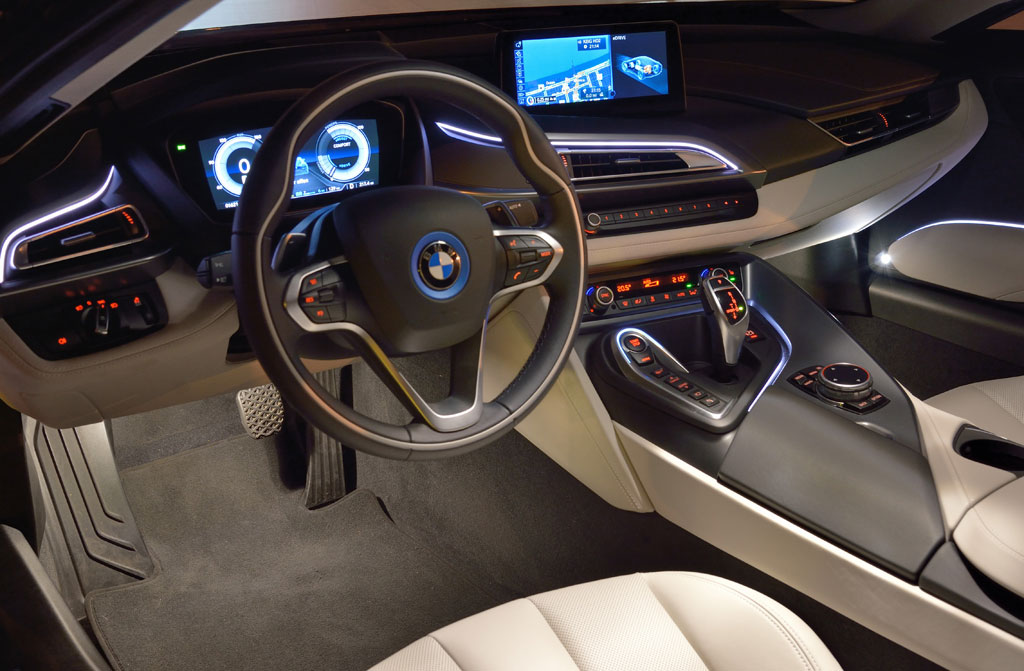The i8 is the first BMW that has Navi Profession in the standard equipped with Navi Professional. The car can also be ordered with laser lights as an option starting in November, because the suppliers are not ready right now. I guess BMW decided to offer it as soon as possible after Audi also announced to start offering laser light, which will be tested first at the Le Mans race cars.