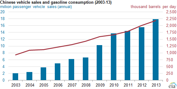 Consumption of gasoline in China grew from 0.9 million barrels per day (bbl/d) in 2003 to more than 2 million bbl/d in 2013. This continues a trend of significant growth in China's transportation sector since the 1990s. Increasing oil demand requires China to import more petroleum from other countries, and since 2009, China has been importing more than half of its petroleum needs. Under the Energy Saving and New Energy Vehicle Plan for 2012 to 2020 released in 2012, average passenger car fuel economy is targeted to increase to 34 miles per gallon by 2015 and 47 miles per gallon by 2020.