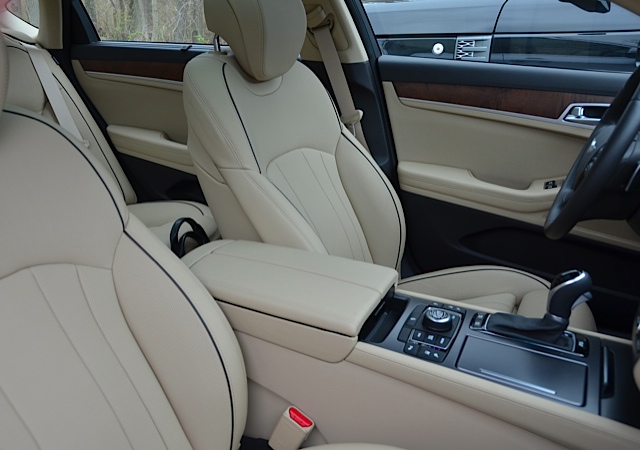 Both the V6 and V8 are mated to eight-speed automatics that provided smooth and comfortable shifts. The eight speeds help to keep the engine operating in its most efficient RPM range. EPA ratings for the V6 rear drive model are 22 mpg combined, with 18 city mpg and 29 highway mpg test ratings. I’d like to see these ratings a bit higher. Perhaps some long distance real world driving would prove them to be low. On a note, Hyundai says they continue to study the diesel engine for their cars.