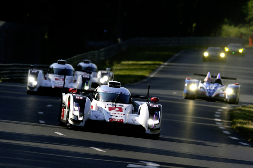 LE MANS - June 15, 2014: For the 13th time, Audi has achieved the ultimate success at the world's most famous automobile race. Le Mans success for the brand with the four rings in only 16 runs – and may have been the most valuable one to date, as Audi Sport Team Joest prevailed against massive competition by Le Mans returnee Porsche and Toyota in an extremely tough race that was completely open for a long time. The decision in favor of the two Audi R18 e-tron quattro cars was only made in the final phase.