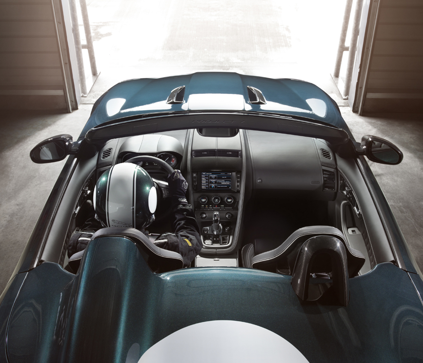 The interior features carbon-fiber inserts on the console, machined aluminum gearshift paddles and bespoke treadplates with the Project 7 logo.
