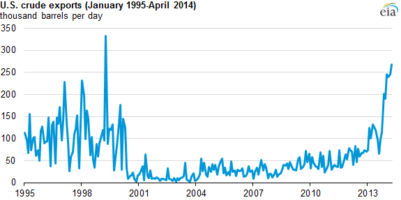 The United States exported 268,000 barrels per day (b/d) of crude oil in April (the latest data available from the U.S. Census Bureau), the highest level of exports in 15 years. Exports have increased sharply since the start of 2013 and have exceeded 200,000 b/d in five of the past six months. The increase in crude exports is largely the result of rising U.S. crude production, which was 8.2 million b/d in March.