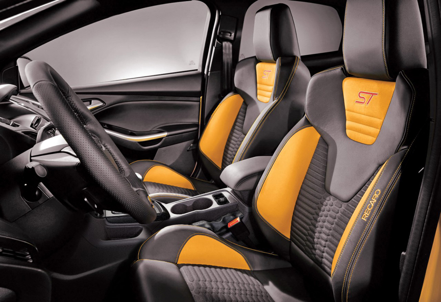 COMFORT: As outside, interior changes are small but notable. Appropriately high-bolstered Recaro seats are trimmed with body-color cloth. Access is easier than appearances might indicate, and comfort and support are as expected -- very, very good. The driver's seat is height-adjustable, which, with the tilt-and-telescope adjustable steering wheel, makes it easy to find a comfortable driving position. Interior design is, unsurprisingly, similar to other Focus models. Soft-touch materials and first-class fit and finish make it seem above its modest price. Backlit main instruments are easily read in all lighting, and cruise, audio, phone, and MyFordTouch controls on the spokes of the leather-rimmed steering wheel add convenience. If you dig deeply enough into the system info, there's even an "Eco Mode score"… yeah, that's a game that will be played a lot by owners, lol. Maybe if the fuel gauge is ignored too long…
