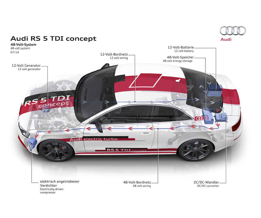 Audi recently showcased the scope of the 48‑volt electrical system with the technology demonstrators Audi A6 TDI concept and RS 5 TDI concept. Both models are fitted with an electrically powered compressor. This operates independently of the engine load and therefore fundamentally improves the acceleration performance. 48‑volt technology is moreover ideal for realizing convenience systems for dynamic chassis control. Audi will shortly be unveiling a variety of applications in this field.