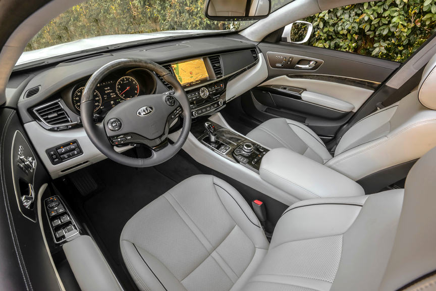 APPEARANCE: All of Kia's best styling cues appear here, with further development. The K900 is a handsome car, with proportions proper for a luxury sedan. It has presence, and not just because of its size -- just over 200 inches long on a near-120-inch wheelbase. The tabbed grille, sculpted hood, strong shoulders, sleek roofline, and faux vents just ahead of the front doors are familiar, but taken to the next step. LED headlamps look like spaceship ray gun emplacements -- and do a fine job of lighting the road at night. The front chin and rear apron are pleasantly different from other cars. There's just enough chrome to establish the K900's luxury nature without being excessive.