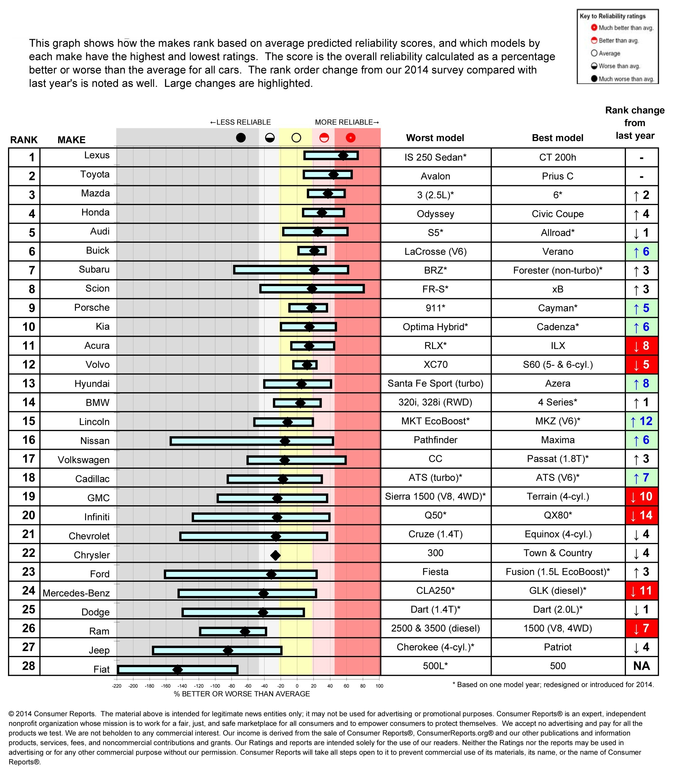 This Reliability Study covers just about all cars and light trucks in the U.S. market for 2014 and it is based on extensive Consumer Reports testing and on surveys of over a million CR subscribers. Twenty-eight brands and a multitude of models were evaluated. Vehicles are rated on a curve resulting in five categories, two on either side of “average.”
