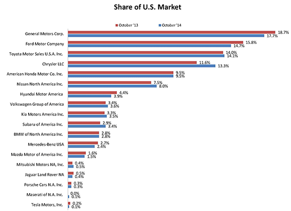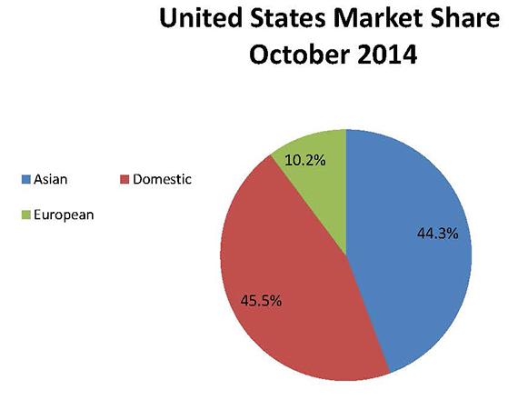 Asian brands decreased their share of the market slightly from September’s 44.6 percent market share, capturing 44.3 percent. They sold 567,653 vehicles, up from 556,150 in September. Sales for Asian brands were also up 7.8 percent over October 2013 when they sold 526,814 vehicles and held 43.6 percent of the market. European brands maintained their momentum in October, taking 10.2 percent of the U.S. market, up from 9.5 percent last month and 8.5 percent in August. In total, they sold 130,539 vehicles, up from 118,721 in September. October sales also represented a 4.3 percent improvement for European nameplates over last October when they sold 125,194 units and occupied 10.4 percent of the U.S. auto market. Domestic nameplates finished the month with 45.5 percent of the market and sales of 583,121 vehicles, which was down from the 45.8 percent share they held in September.