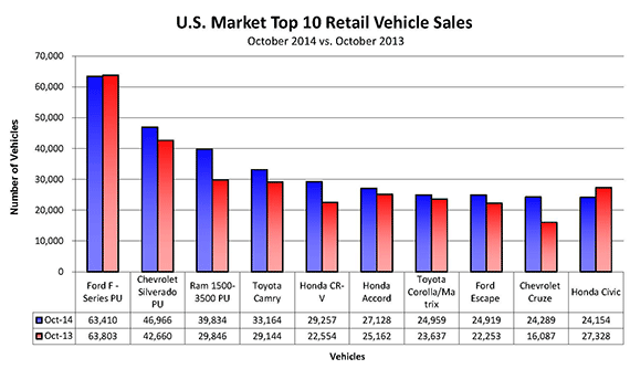 International nameplate models occupied five of the top ten-selling vehicle spots in October. At number four behind the Ford F-Series, Chevrolet Silverado, and Ram pickups, the Toyota Camry regained its lead as the top-selling car in the U.S. It was outsold by the Honda Accord in August and September. The Accord slipped to the sixth position behind the Honda CR-V, which was up 29.7 percent over October 2013. The Toyota Corolla also made a strong showing in October, occupying the seventh spot, while the Honda Civic—in tenth place—rounded out the list of top-selling international nameplates.
