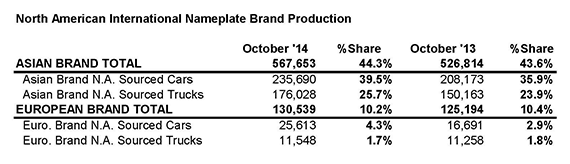 According to AutoData Corp., 235,690 cars built by Asian brands in North America represented 39.5 percent of all cars sold in the U.S. in October. Asian brands also sourced 176,028 trucks from these facilities, representing 25.7 percent of all U.S. truck sales. Meanwhile, European brands sourced 25,613 cars (representing 4.3 percent of total U.S. car sales) and 11,548 trucks (representing 1.7 percent of total U.S. car sales) from their North American facilities.