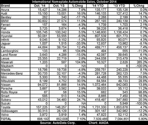 Internationals’ share of the U.S. auto market climbed in October. Together, Asian and European brands occupied 54.5 percent of the market, up from 54.1 percent in September, but down from the 56.5 percent share they held in August. In total, international nameplate brands sold 698,192 vehicles, up from 674,871 last month and down from 895,602 in August.