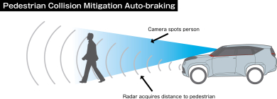 Pedestrian Collision Mitigation Auto-braking utilizes both radar- and camera-based systems to detect when a pedestrian walks in front of the vehicle, then automatically applies the brakes to help mitigate injury to the pedestrian or to avoid a collision altogether.
