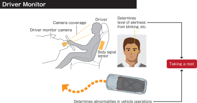 The Driver Monitor, using sensors in the steering system and driver’s seat, as well as a camera positioned in front of the driver, detects changes in the driver’s posture and/or eye blinking to determine their level of alertness. If the system detects any abnormalities in driving behavior caused by fatigue or inattentiveness, it will instantly alert the driver. Furthermore, if the system determines that the driver’s level of concentration has diminished or that they are taking their eyes off of the road for too long, it will sound an alert to get the driver’s attention.