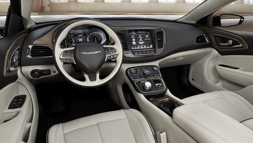 APPEARANCE: Chrysler claims that this is "the new face of Chrysler", inspired by classic American design in the form of Chris Craft wooden boats and Airstream travel trailers. PR hype, sure -- but it is distinctive and handsome. The overall shape is smoothly rounded, with strategically-placed character lines providing contrast and adding visual interest. From the front, a new winged interpretation of the Chrysler logo is featured in the upper grille, which itself echoes the wing shape as it blends into the headlights. Optional LED running lights add a contemporary upscale touch. The lower grille is a near inverse of the upper, blending into the foglamps. From the side, the passenger cabin dominates, with the base of the windshield near the front wheels and a near-fastback roofline that makes for an almost coup-like look. The high rear deck ends in an arched ducktail, and LED taillights define the rear view. S models have gloss black grille and side window trim while others get chrome. The C also get chrome-trimmed door handles.