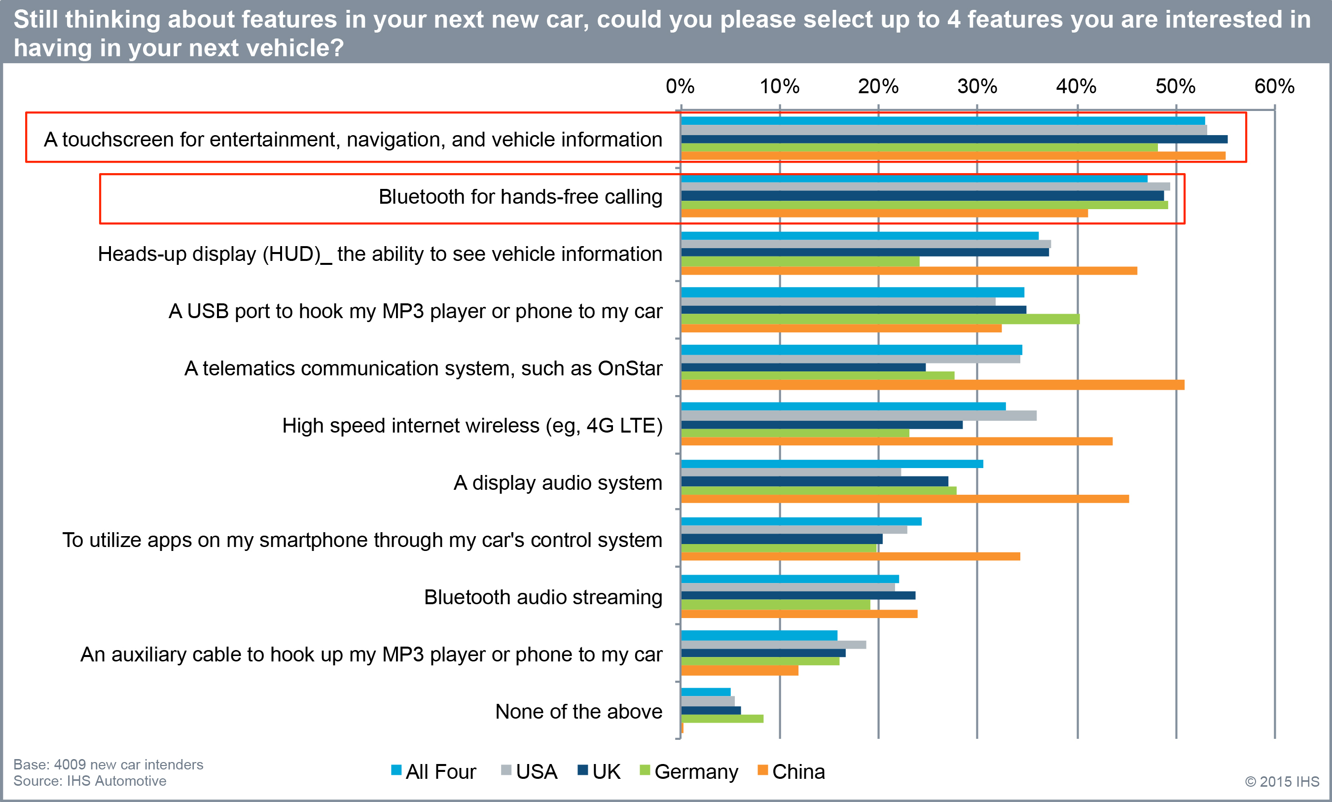 A new report, Apps in the Car 2015, includes highlights from a recent consumer study conducted by IHS Automotive. More than 4,000 vehicle owners intent on purchasing a new vehicle within the next 36 months were surveyed, representing four key automotive markets – the U.S., China, Germany and the United Kingdom. While results varied by region, key findings shed light on consumer preferences that manufacturers and apps developers can use to best address market needs as they develop new products for the global marketplace.