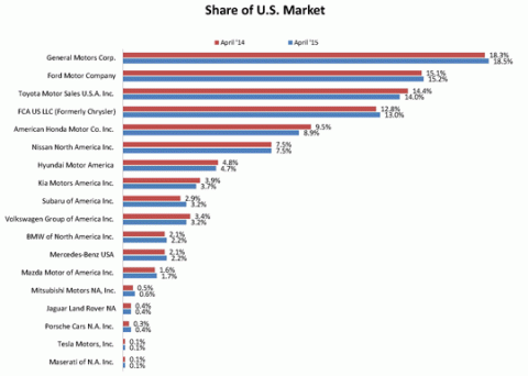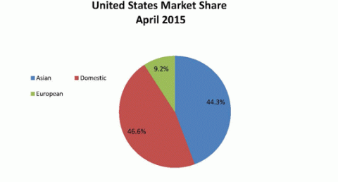 Asian automakers occupied 44.3 percent of the U.S. market, down from 46.7 percent last month and 44.9 percent in April 2014. Sales of 644,116 units were down from the 722,125 vehicles they sold last month, but still improved slightly over the 624,892 vehicles they sold last April. European brands held 9.2 percent, down slightly from 9.4 percent last month, but up from 9 percent last April. Overall sales of 133,394 were down from 144,972 vehicles sold in March, but up from last April when they sold 125,436 vehicles. Domestic brands finished April with 46.6 percent of the U.S. market, up from 43.9 percent in March and 46 percent in April 2014. They sold 677,441 vehicles, down from the 678,705 sold last month.