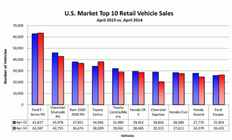 Compact models also made a strong showing for the month with the Toyota Corolla logging a fifth place finish for the month and a 10.1 percent sales improvement. In eighth place, Honda Civic sales were up 2.8 percent. The Honda CR-V was the only international compact SUV model that cracked the month’s top ten list, finishing in sixth place with a 3.4 percent sales improvement over April 2014. In ninth place, the Honda Accord also demonstrated its staying power among American buyers, although sales were down 20.1 percent for the year.
