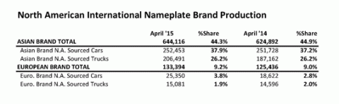 International brands sourced 499,375 of their April vehicles from North American manufacturing operations, down slightly from 552,492 last month. North American plants run by Asian automakers produced 458,944 vehicles, including 252,453 cars (37.9 percent of all cars sold in the U.S.) and 206,491 trucks (26.2 percent of all trucks sold in the U.S.). European plants produced 40,431 vehicles, including 25,350 cars (3.8 percent of all cars sold in the U.S.) and 15,081 trucks (1.9 percent of all trucks sold).