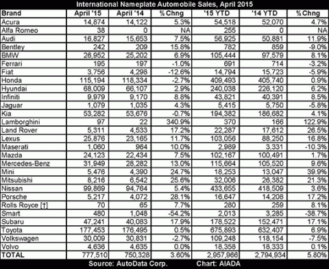 Alexandria, VA -- May 4, 2015: The American International Automobile Dealers Association (AIADA) today released April 2015 sales figures for the international nameplate automobile industry. AIADA represents America’s approximately 10,000 international nameplate franchises whose brands accounted for 53.5 percent of all vehicles sold in the United States last month.