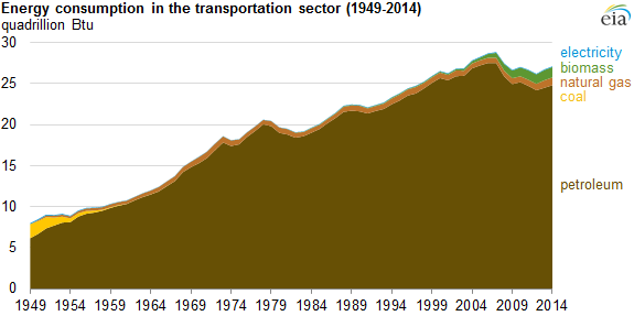 Republished May 18, 2015; In the United States, petroleum is by far the most-consumed transportation fuel. But recently the share of fuels other than petroleum for U.S. transportation has increased to its highest level since 1954, a time when the use of coal-fired steam locomotives was declining and automobile use was growing rapidly. The recent increase can be mostly attributed to increased blending of biomass-based fuels with traditional vehicle fuels and growing use of natural gas in the transportation sector.