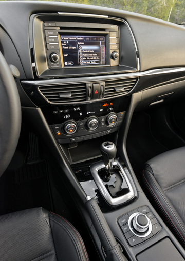 COMFORT: At premium Grand Touring level, the Mazda6 interior is close to entry-luxury in design and content. Styling is as cohesively flowing inside as out, and materials are first-class. Textured soft-touch synthetics are used for the upper surfaces of the doors and instrument panel, where they eliminate glare. Matte-silver trim is used around the vents, instruments, and shifter, and on the IP and doors. Leather covers the seating surfaces, and here both front seats are power-adjustable and heatable. They are among the best in class for comfort and support. The leather-rimmed steering wheel adjusts manually for tilt and reach and has controls for audio, information, cruise, and Bluetooth phone systems. Audio and navigation systems are controlled by a knob on the console which is surrounded by hard buttons for system choice. Use is reasonably intuitive. A tilt-and-slide moonroof lets light in when desired. There is a 12VDC power point and open space at the front of the console, bottle holders in all doors and some storage in the fronts, a moderately large glove box, and a deep console box with audio attachment and power. Rear passengers get a contoured bench, but its width and the low central tunnel make the center position more useful than in some other cars. The seatback folds 60/40. The trunk is usefully large and there is a space-saver spare tire under the load floor.