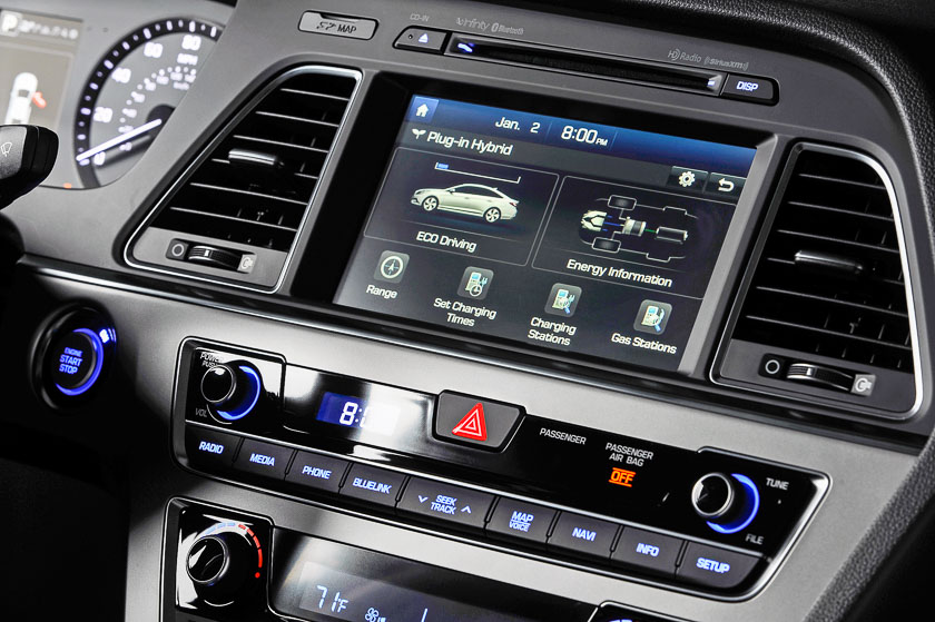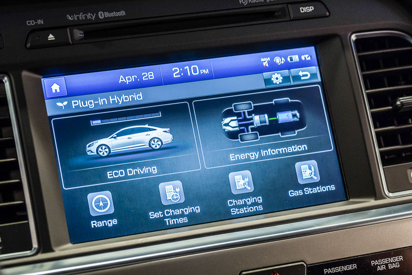 For personal pleasure the front seats are ventilated, heated, and the steering wheel is heated. Navigation is standard, as is the Dimension audio system, which is quite good after a few tweaks. The upper trim level, Limited, adds the extra tech plus leather seats, HID Xenon headlamps, an Infinity audio system, and smart cruise control with full stop capability. Another feature, one we’ll report on fully in another story, is the premier of Android Auto and Apple Car Play, along with enhanced Hyundai Blue Link features designed for the plug-in, like selecting charging times for cheaper power.