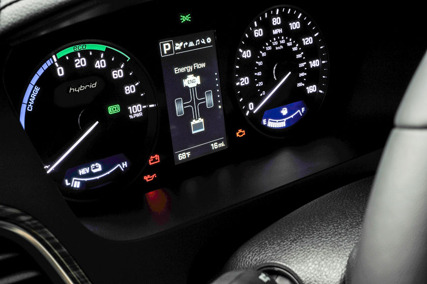 Our first experience with the newer hybrids was driving the 2016 Sonata Plug In Hybrid along the crowded Pacific Coast Highway #1. We pushed the EV-only button, one of three modes, and began exploring the 24 miles of available electric-only range Hyundai said we could have. Of course, like any fuel economy number, EV range is affected by how briskly you accelerate. (Controlling e-motor torque is one of the most important and difficult engineering feats for any car maker; e-motors produce 100% of their torque at anything over zero RPM. How quickly the car is allowed to expend energy through acceleration directly affects range.)