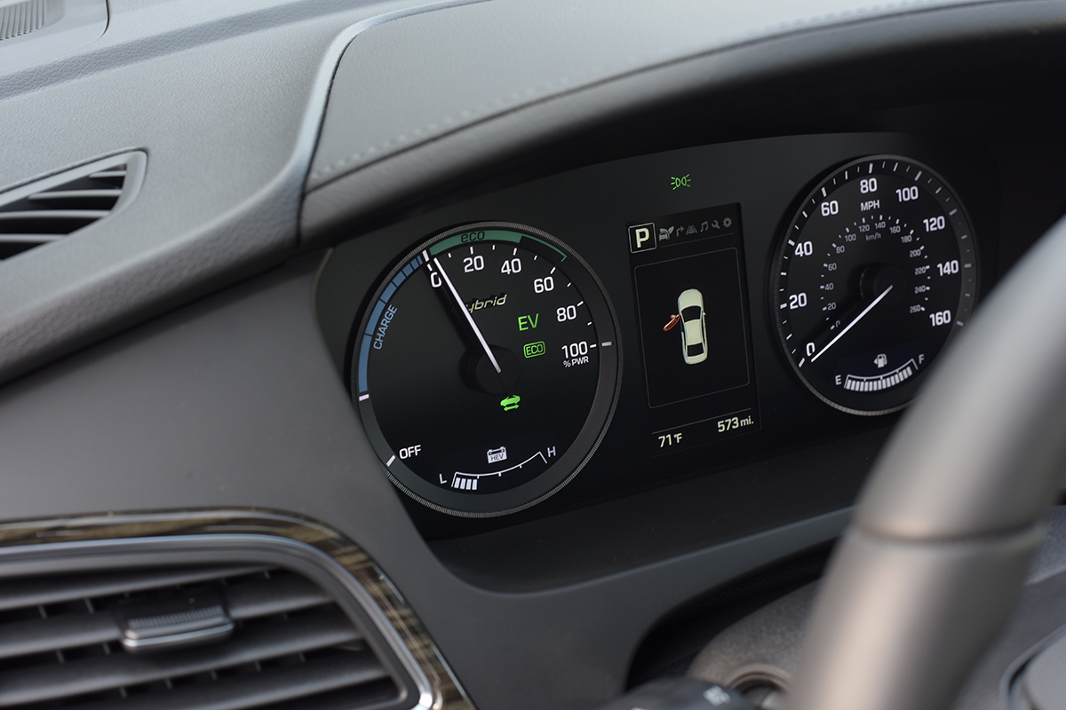 The 2016 is now a bit larger, claiming Best-In-Class headroom and legroom by a whisker. With the flat trunk floor and pass through, interior volume (also for the PHEV) is also best in class versus the outgoing Sonata, Camry, Accord, or Fusion HEVs. Packed in are safety features like Lane Departure Warning, individual tire pressure warnings, Blind Spot Detection, Forward Collision Warning, a virtual engine sound for electric-mode-only pedestrian alert, rear parking sensors, and cruise control that will bring you to a stop—and restart. That’s not the full list by far, we’re missing solar glass, heated mirrors, Xenon headlamps, and many others. What’s missing is automatic braking, and we’re a bit surprised it is not available.