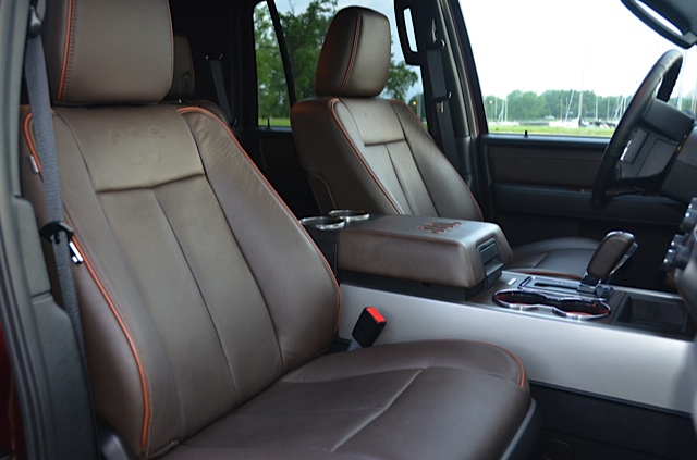 We found the King Ranch interior quite attractive with its Ebony Mesa Leather seating embossed with the famous Running W and Kingsville stitching. Of course there is plenty of room and all kinds of folding choices for the rear seats. Front seats are both heated and cooled and second row rear seats are heated too.