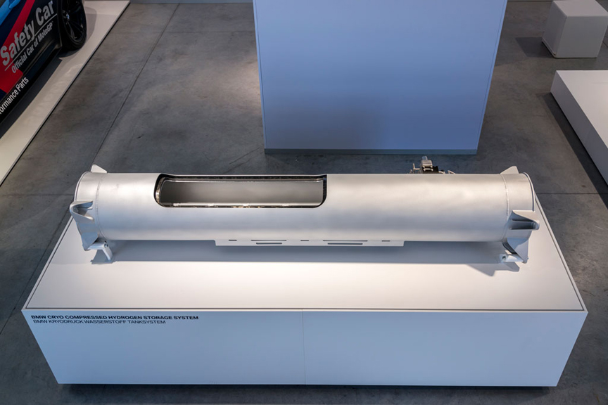 BMW and Toyota jointly developed the auxiliary, but the 180 kW/245 hp electric motor is a variant of the unit used in the BMW i3, while power electronics, the intelligent energy management and the 1 kWh high-voltage battery are based on BMW’s eDrive technology. BMW also developed the 1 kW high voltage battery and the so-called cryogenic pressure storage tank as well as the refueling system. Both have been patented by BMW. On display was also the 6.5 feet long, double-wall cylindrical tank, which is mounted underneath in longitudinal direction as a tunnel tank between the front and rear axle, the place where you normally find the prop shaft. Currently, the industry standard is a technology, which stores 4.5 kg (10 lbs) of hydrogen under a pressure of 700 bar (CGH2).
