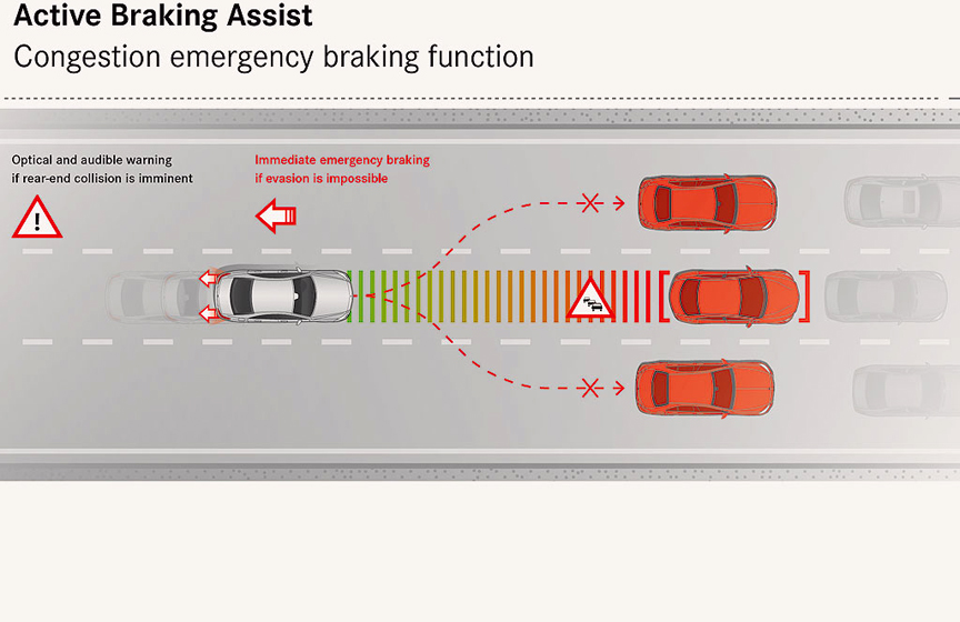 In preparing its cars for the autonomous driving era, Mercedes introduced the Pre-Safe system quite a while ago and it's been continuously enhanced and extended. One such measure is Active Braking Assist, an enhancement of Automatic Braking. This function can warn the driver of imminent crash situations and assist in the event of an emergency stop and, if necessary, apply the brakes automatically. The system detects stopped, stopping, or slower moving vehicles and reacts to crossing traffic at junctions as well as the tail ends of traffic jams and pedestrians walking in the path of the car.
