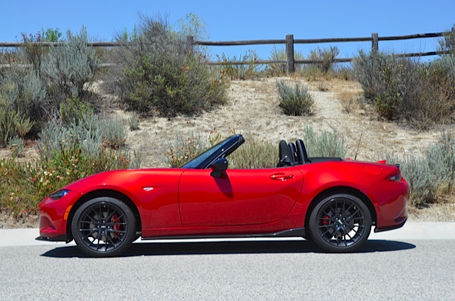 In our test drive we drove freeways and two lane open roads, along with a few residential streets. The Miata’s engine and transmission delivered everything we asked of it. Acceleration, highway merging, passing and cruising are all done with ease. The manual transmission is as smooth as butter to shift with short throws that firmly engage each gear. The light weight of the MX-5 is evident in the vehicle’s overall performance.