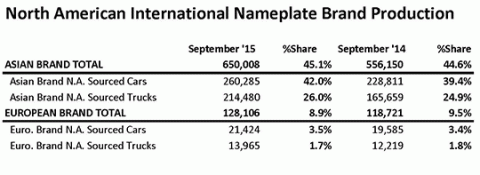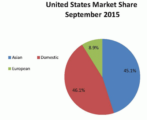 As a segment, Asian nameplates fell to the domestics in September, occupying 45.1 percent of the U.S. market, a decrease from 46.6 percent in August. Overall they sold 650,008 vehicles, down from 735,056 in August but up from 556,150 in September 2014. European nameplates rose from 8.7 percent market share in August to 8.9 percent last month. They sold 128,106 units last month, down from 137,782 units in August but up from 118,721 units a year ago. Domestic brands rose from 44.7 in August to 46.1 percent of the market in September.