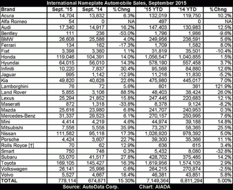 AutoData Corp. reports that the seasonally adjusted annual rate (SAAR) in September was 18.17 million units versus 16.52 million units a year ago. This is the highest reported SAAR since July 2005. Industrywide, 1,442,460 light vehicles were sold last month, compared to 1,577,407 in August and 1,246,006 a year ago. Sales for all brands in 2015, unadjusted for business days, are up 5 percent from 2014 and 15.8 percent from September 2014.