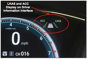 Designed for the U.S. road structure, the system uses a monocular camera mounted on the upper portion of the windshield to identify painted lanes, Botts' Dots and Cat Eye markers at speeds between 45 mph and 90 mph. When LKAS senses that the driver is drifting from the middle of a detected lane, the system generates corrective steering torque to assist the driver in maintaining lane position.